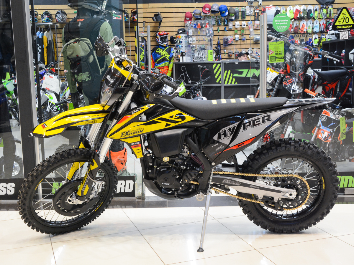 Кроссовый мотоцикл FXmoto HYPER (NC300S) 300 CC. Двигатель ZONGSHEN ZS NC300 S два распредвала. Водяное охлаждение и 6 скоростей, электро и кикстартер. Амортизаторы: перед ККЕ  перевернутого типа полностью регулируемые, 940мм -54/60 Ф48, ход 270 мм. Задний ККЕ полностью регулируемый с бачком, 480 мм - поршень Ф40 и ход 110. Обода перед : 21" -7116 усиленные UNISON ALUMINUM RIM. Задний : 18"- 7116 усиленные UNISON ALUMINUM RIM. Защита радиаторов алюминиевая. Вентилятор охлаждения PANASONIC. Антибуксаторы перед/зад. Глушитель у мотоцикла алюминий (копия FMF), труба с резонатором нержавеющая сталь,Звезды перед/зад 13/51- 520 CNC. Рычаг КПП анодированный алюминий. Педаль тормоза алюминиевая регулируемая. Цепь NIBBI 520 HIGH-END усиленная. Руль: Алюминий 7075 сечение 28/22. Рычаги сцепления и тормоза складные 3 положения. Ручка газа NIBBI и защита рук армированная с алюминиевой вставкой. Карбюратор NIBBI FCR36 (фильтр NIBBI). Бак увеличенный черный 10,5 литра. Траверсы CNC и маятник CNC алюминий 6061. Прогрессия полностью алюминиевая CNC. Армированные шланги тормоза перед и зад. Шины перед/зад CHAOYANG 80/100-21.110/100-18. Защита переднего тормозного диска. Спицы усиленные перед/зад 3,95мм/4 мм. Подшипники полностью Тайвань. Фара 5 диодов + ходовые огни, цифровой спидометр (щиток номера). Защита двигателя с боковинами пластиковая. Высота по седлу 940 мм. Размеры L×W×H (mm): 2200 x 940 x 1300 мм.